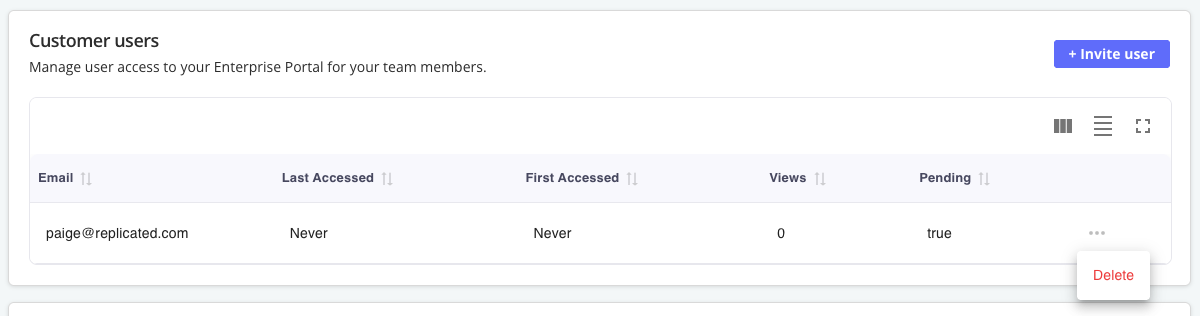 2. In the Customer users table, find the target customer and open the dot menu. Click Delete.